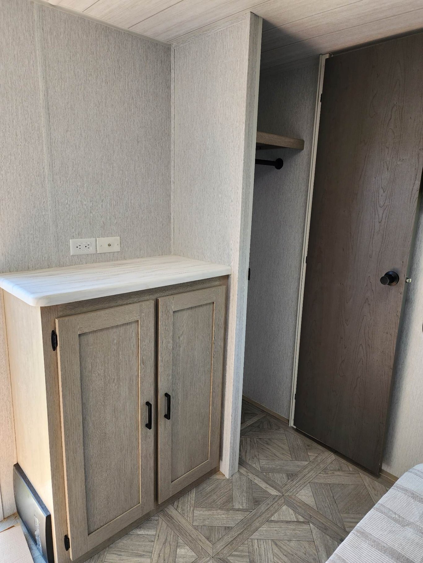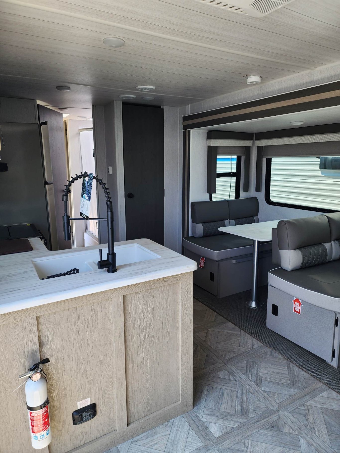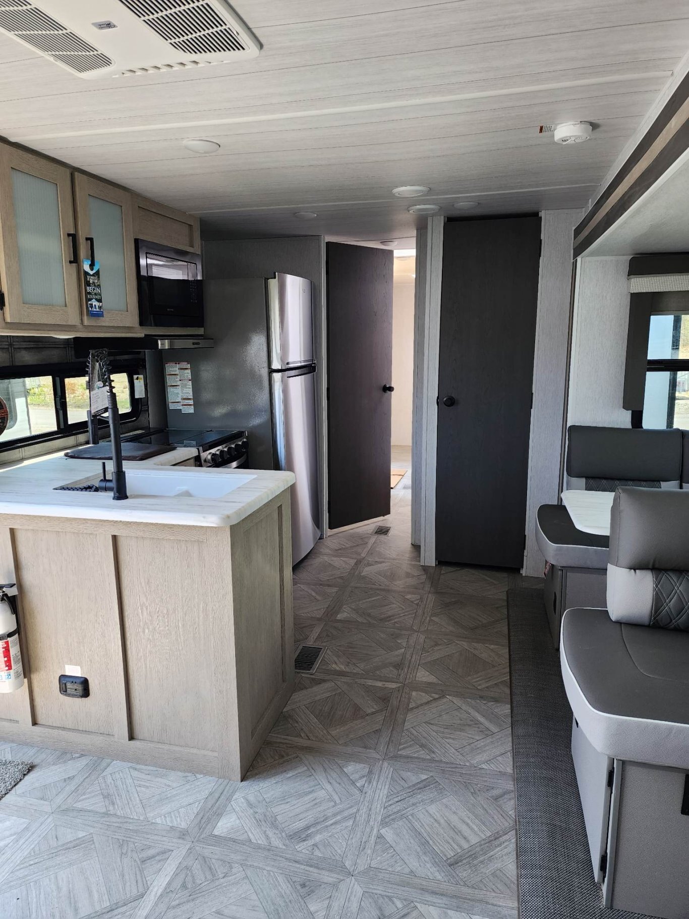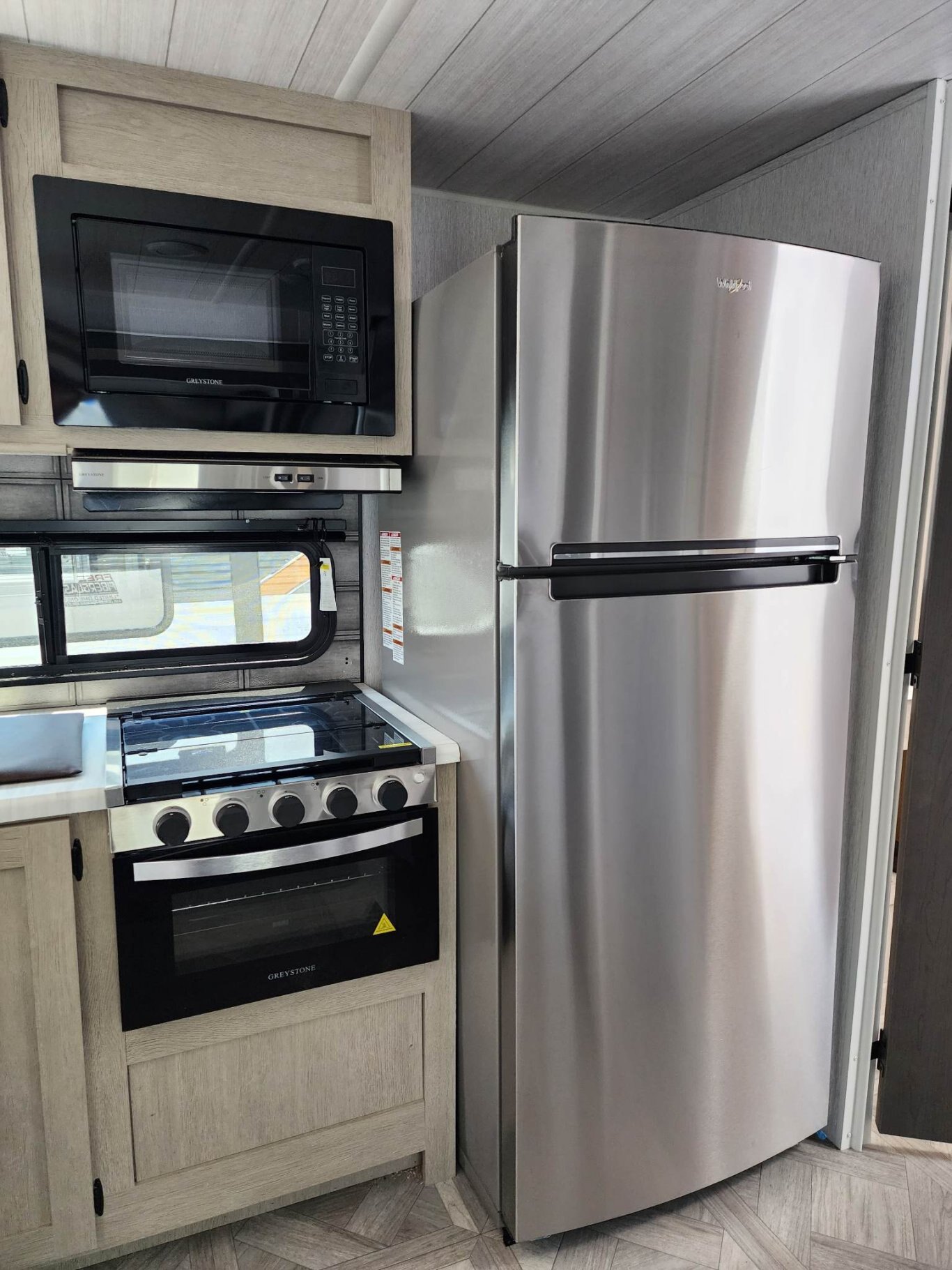Inside, you’ll find a walk-around queen bed, a bright interior with large panoramic windows, and a cozy fireplace for year-round comfort. The full kitchen includes a residential refrigerator, generous counter space, and modern cabinetry in the stylish Capri décor. The sliding patio door brings in natural light and enhances the residential feel.
