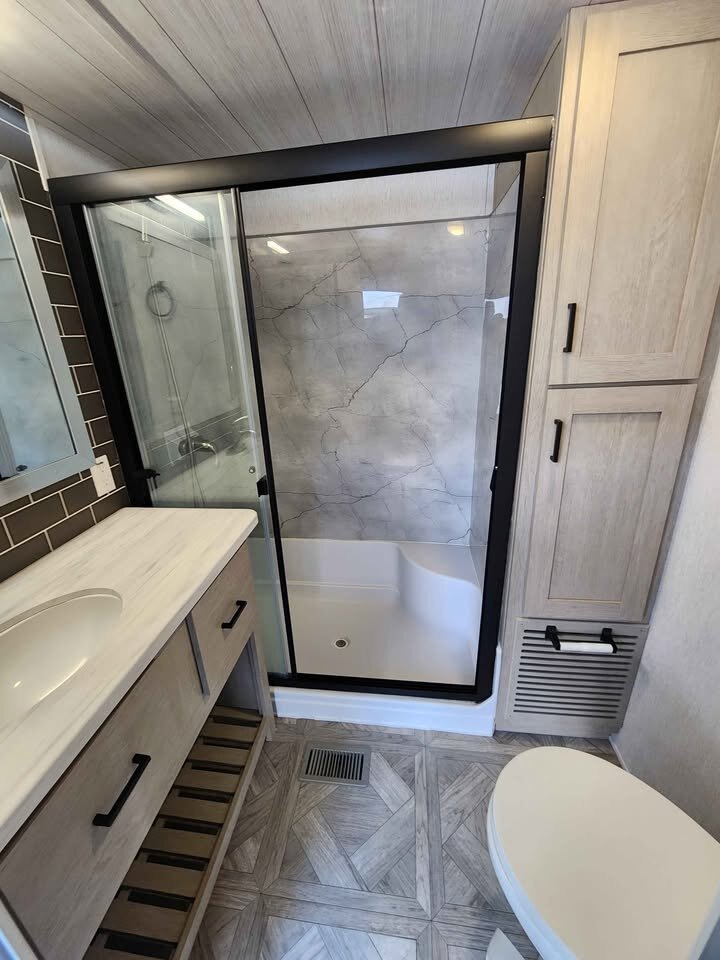 The bathroom is equally impressive, highlighted by a 50” walk-in shower. The rear living area is designed for relaxation and includes a pull-out sofa, reclining theater seating, and a soundbar for a true home-theater experience. Additional luxury touches such as a built-in central vacuum system set this Grand Lodge apart from the rest.