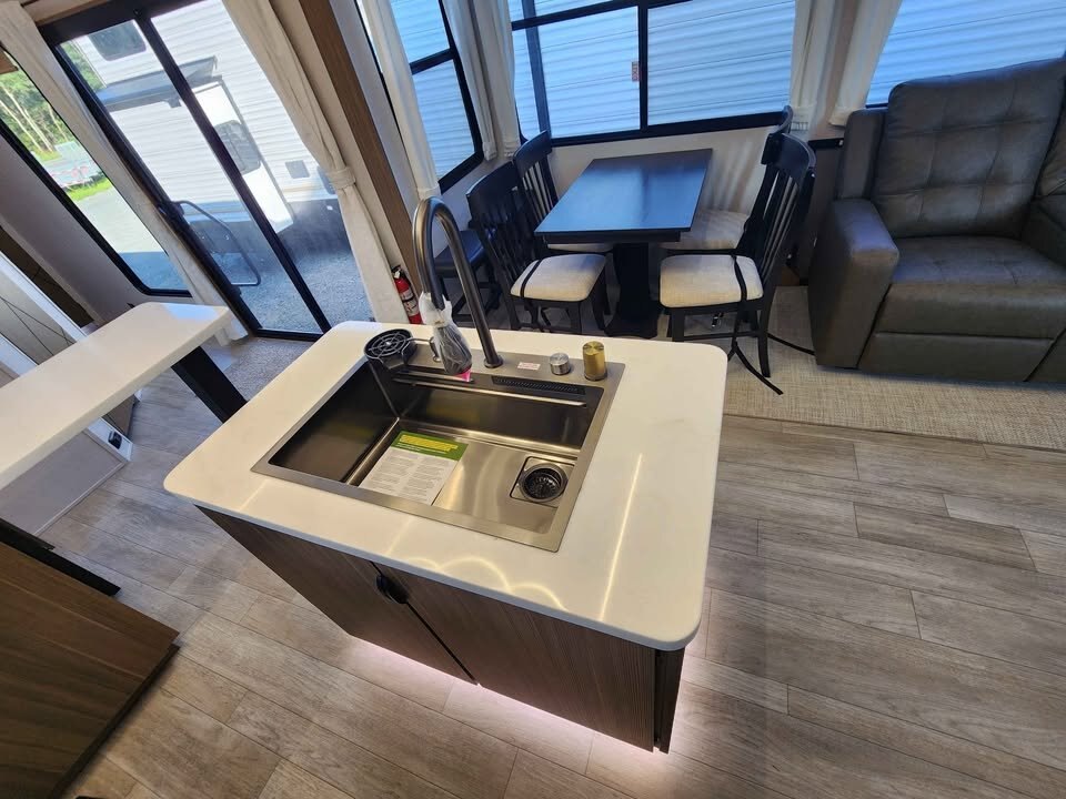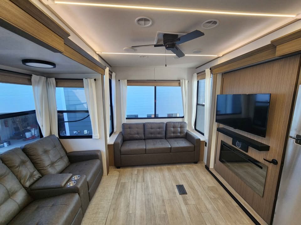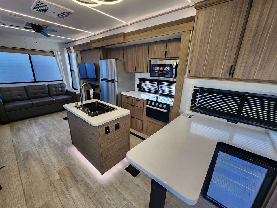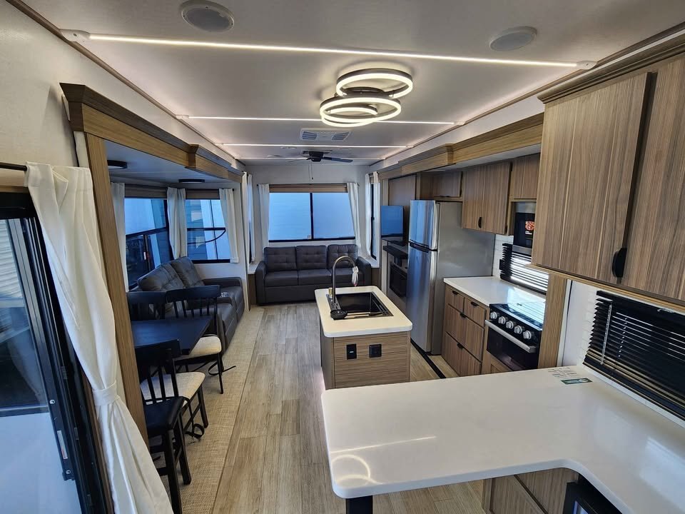 At the heart of the unit is the island kitchen, complete with residential-style appliances and ample counter space for meal preparation and entertaining. The panoramic windows flood the living area with natural light and provide outstanding views, enhancing the open, airy feel throughout the trailer.