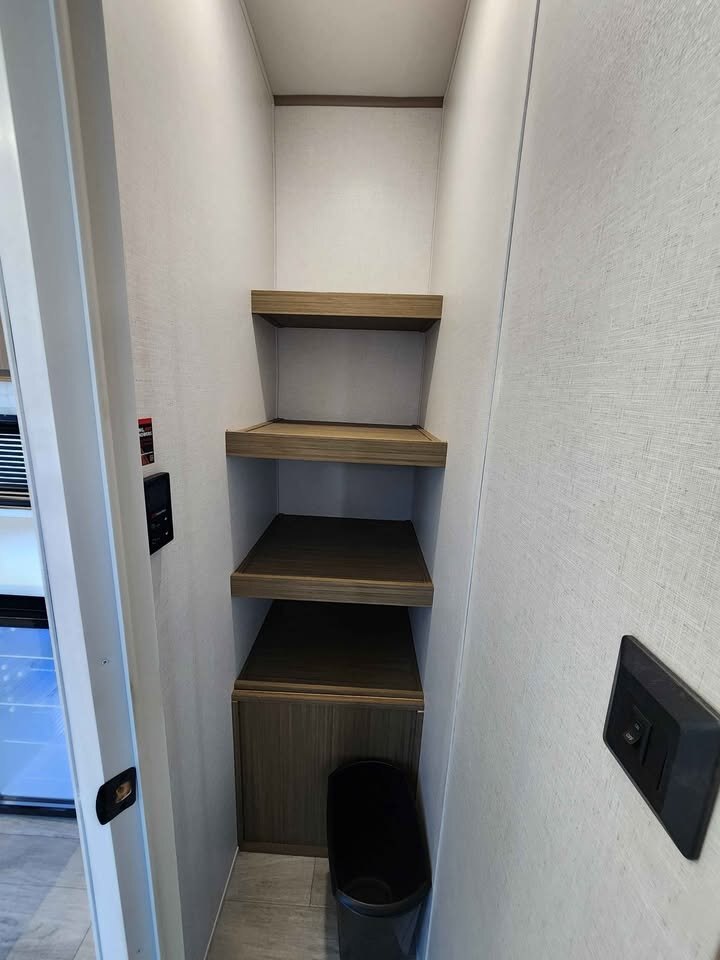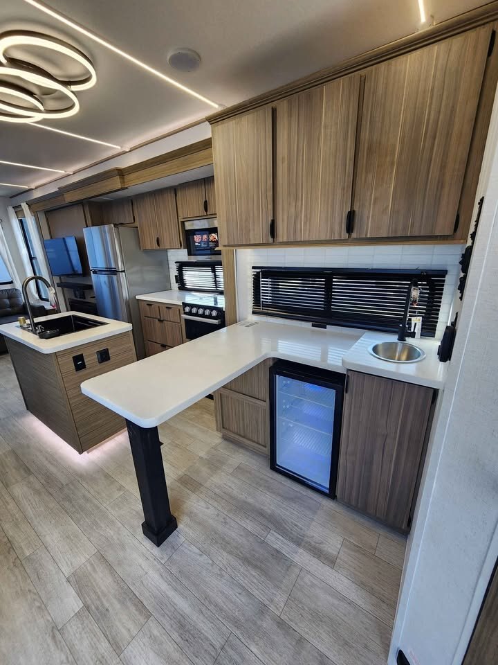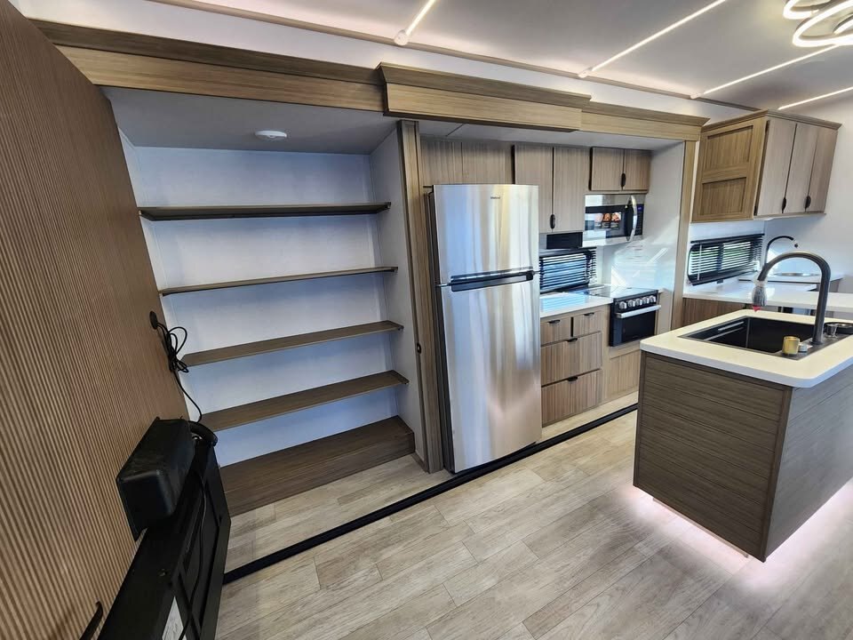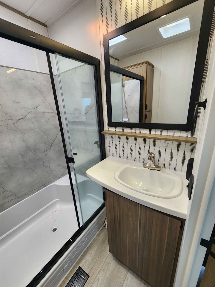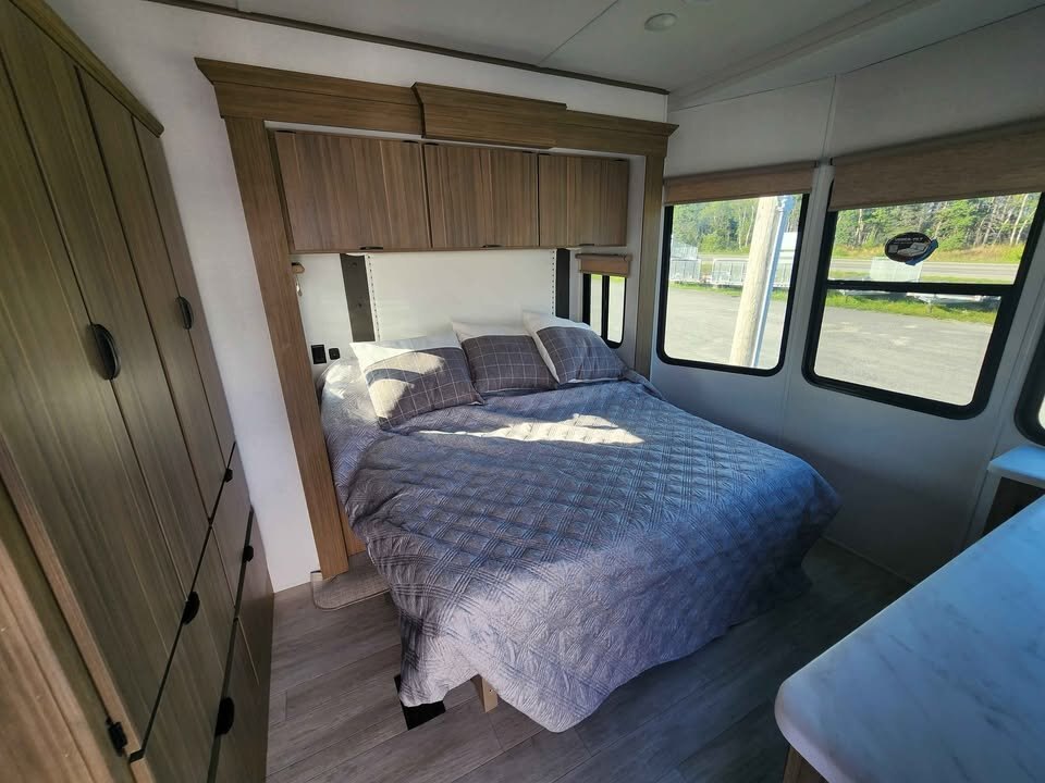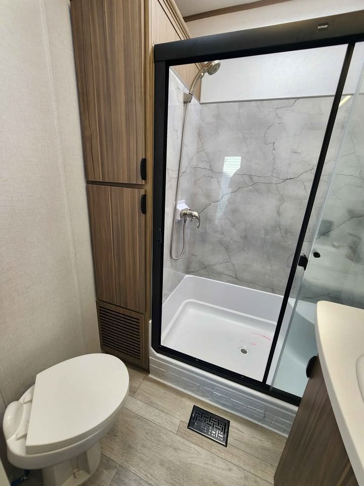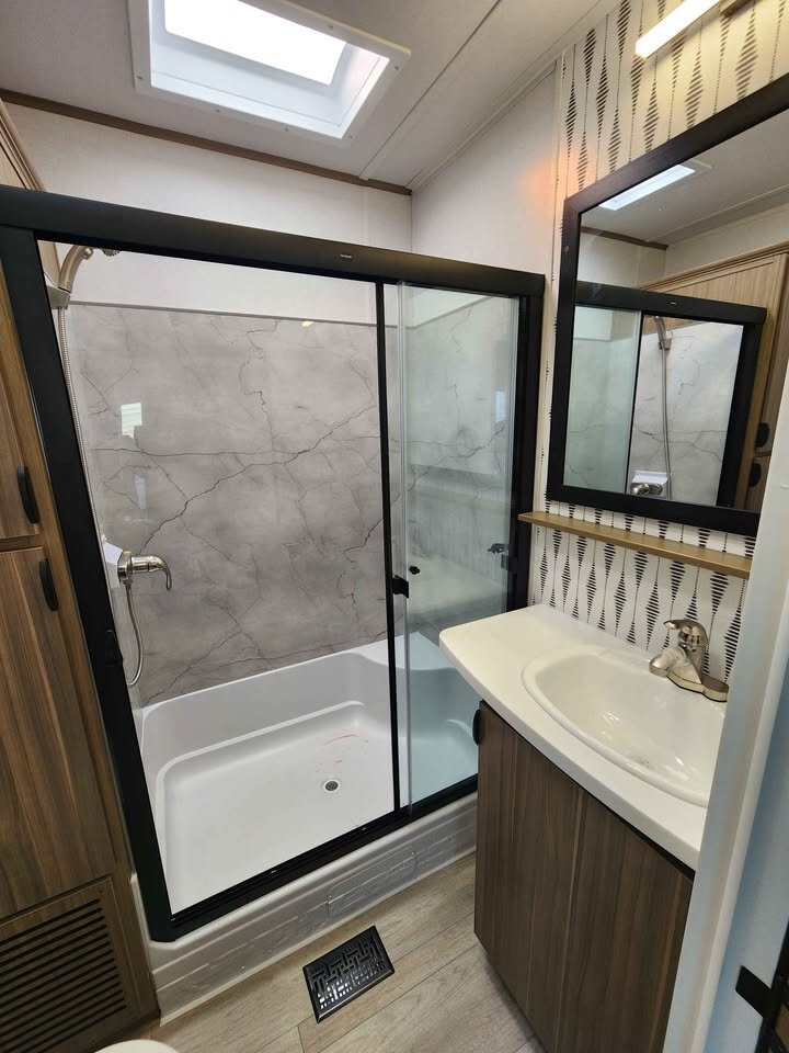 The large king bedroom provides generous storage and privacy, making long-term living comfortable and practical. The spacious bathroom features a walk-in shower with built-in seat, skylight, and linen cabinets, adding a touch of luxury rarely found in traditional travel trailers.