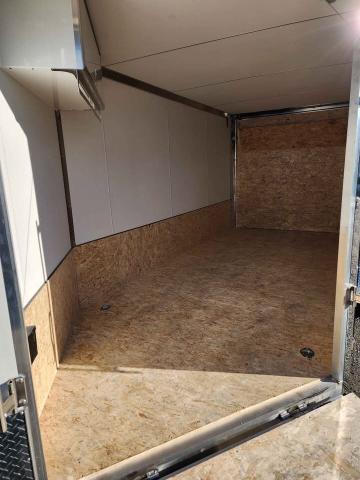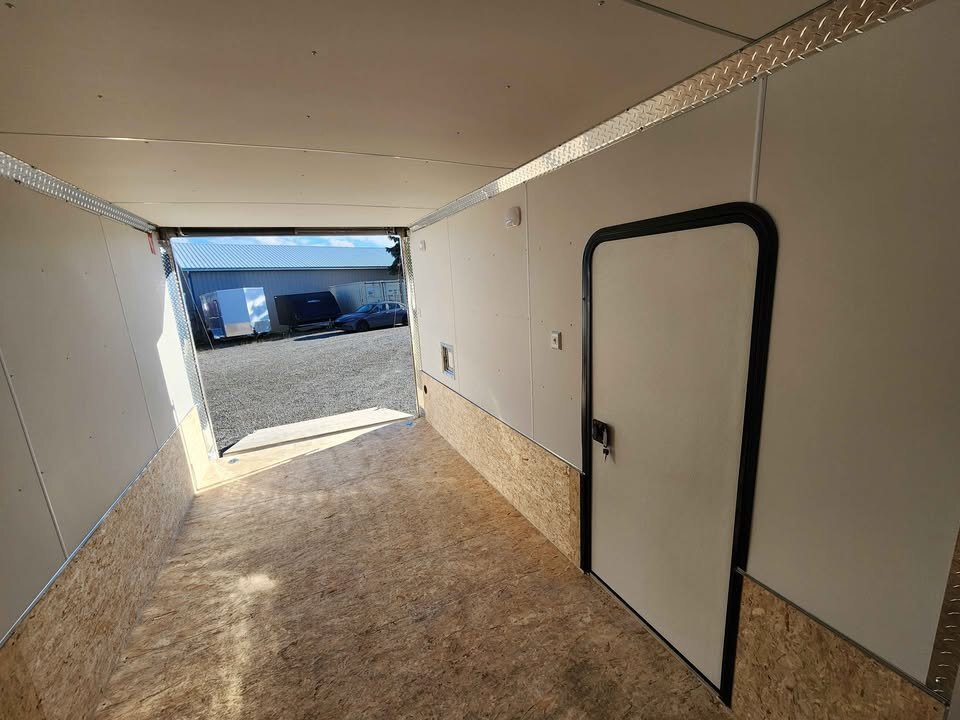 Inside, the trailer features a finished white vinyl interior, helmet cabinet, flush-mounted D-rings, and extra height with an 82" rear door opening, making it ideal for modern snowmobiles. Exterior upgrades include rear spoiler with loading lights, rear deluxe loading jacks, fuel door, sport flaps, and stainless steel locking bars. The two-tone White/Black exterior gives this Explorer a clean, sharp look.