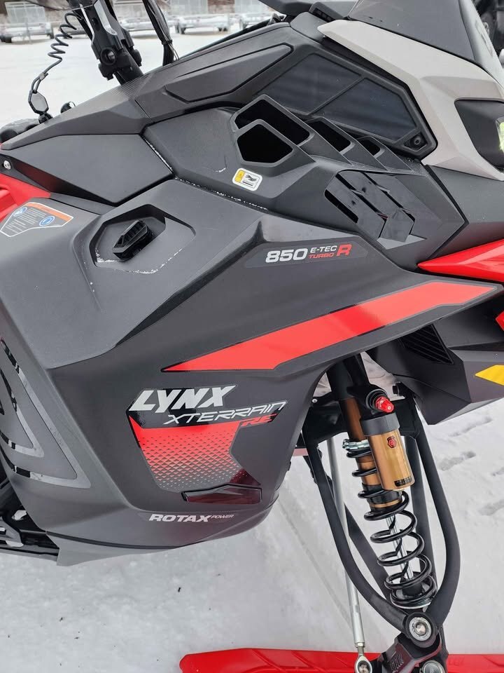 The 2025 Lynx Xterrain RE 850 Turbo R is a premium backcountry snowmobile built for riders who demand power, control, and cutting-edge technology. Powered by the Rotax 850 E-TEC Turbo R with SHOT electric start, this sled delivers instant throttle response and class-leading performance in deep snow and technical terrain.